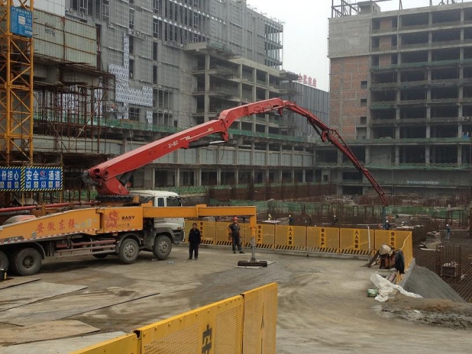 合肥綠地中央廣場位于高鐵路與廬州大道交口,高鐵南站旁。該項(xiàng)目由合肥建工集團(tuán)承建,其中塔樓D建筑高度為200m,底板砼強(qiáng)度為C45P8,12000立方砼一次性連續(xù)澆筑,我公司48小時完成該項(xiàng)目12000方砼連續(xù)澆筑。該部位砼難點(diǎn)在于水化熱的控制,因?yàn)樵O(shè)計(jì)強(qiáng)度高(C45),底板核心筒位置厚度達(dá)9m。經(jīng)過我公司技術(shù)團(tuán)隊(duì)的精心設(shè)計(jì),優(yōu)化配合比,采用優(yōu)質(zhì)粉煤灰.礦渣粉雙摻,降低水泥用量等技術(shù)措施,該項(xiàng)目底板沒有出現(xiàn)裂縫。經(jīng)過長達(dá)15天的溫度監(jiān)測,砼中心溫升未超過60攝氏度,溫差未超過25攝氏度,該部位施工完美結(jié)束。